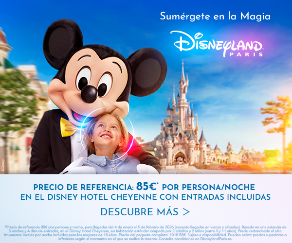 *Precio de referencia 85€ por persona y noche, para llegadas del 4 de enero al 5 de febrero de 2026 (excepto llegadas en vienes y sábados). Basado en una estancia de 3 noches y 4 días de entradas, en el Disney Hotel Cheyenne, en habitación estándar ocupada por 2 adultos y 2 niños (entre 3 y 11 años). Precio redondeado al alza. Impuestos locales por noche incluidos para los mayores de 18 años. Precio del paquete completo: 1018.58€. Sujeto a disponibilidad. Pueden existir precios superiores o inferiores según el momento en el que se realice la reserva. Consulta condiciones en DisneylandParis.es.